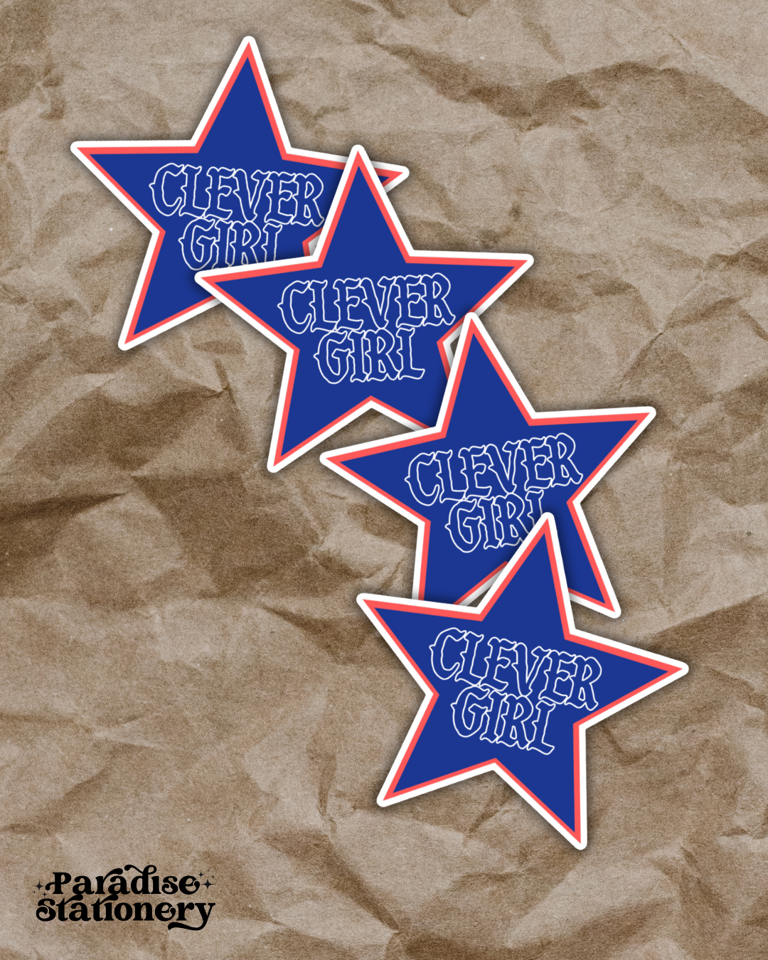 Bring some bold energy to your laptop, water bottle, or journal with the Clever Girl Star Sticker. Featuring a striking red, white, and blue star with gothic-inspired lettering, this sticker makes a statement wherever you place it.