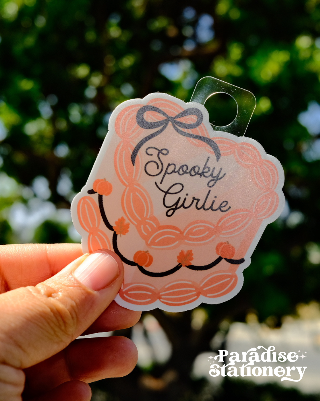 Add a touch of feminine Halloween charm to your belongings with this adorable "Spooky Girlie" pumpkin sticker! This premium vinyl decal features elegant script lettering surrounded by decorative pumpkin borders with a charming bow accent, perfectly capturing the girlie spooky aesthetic.